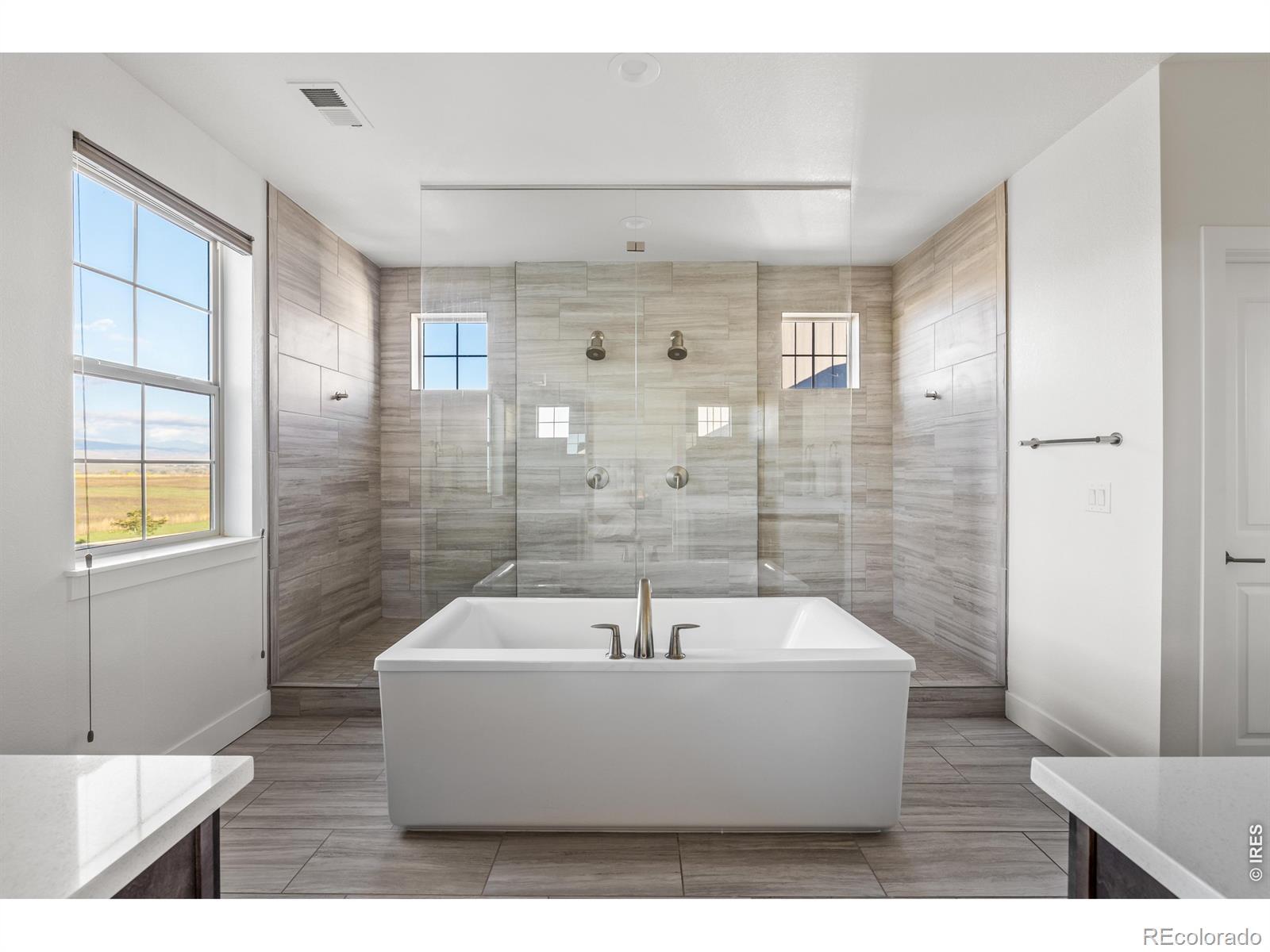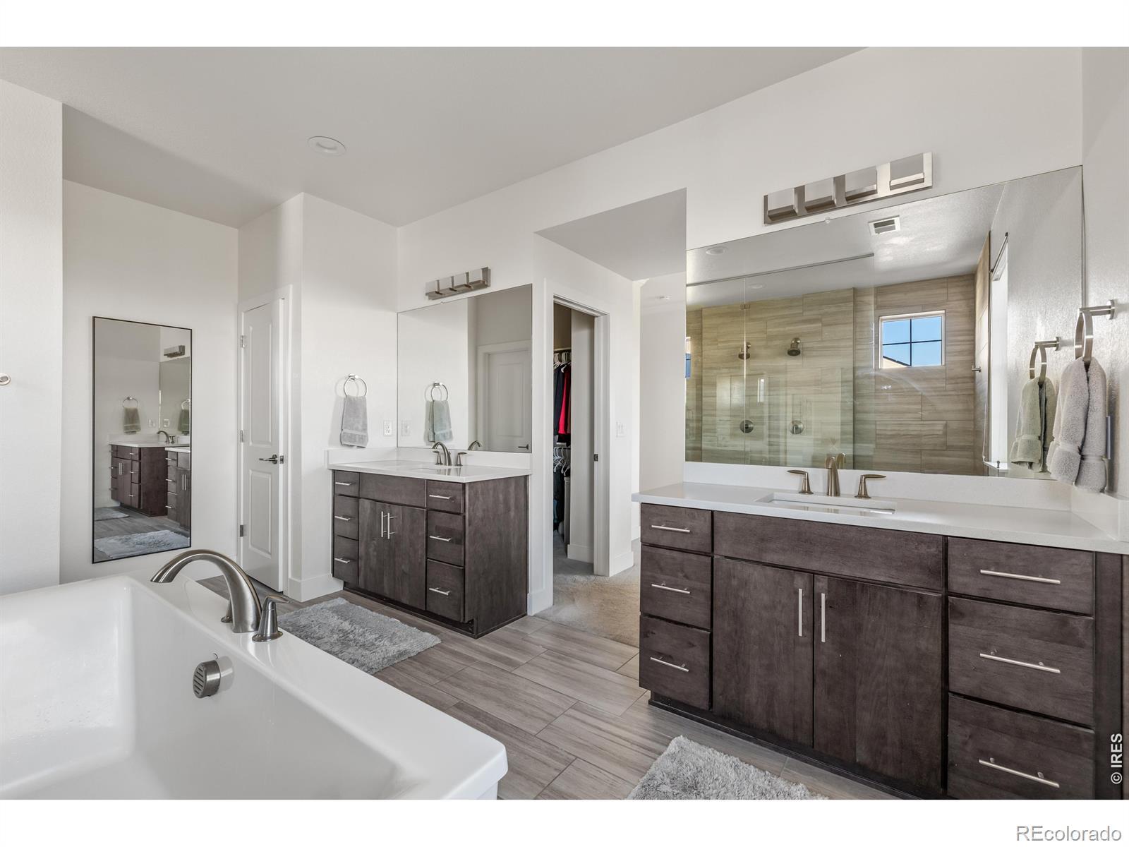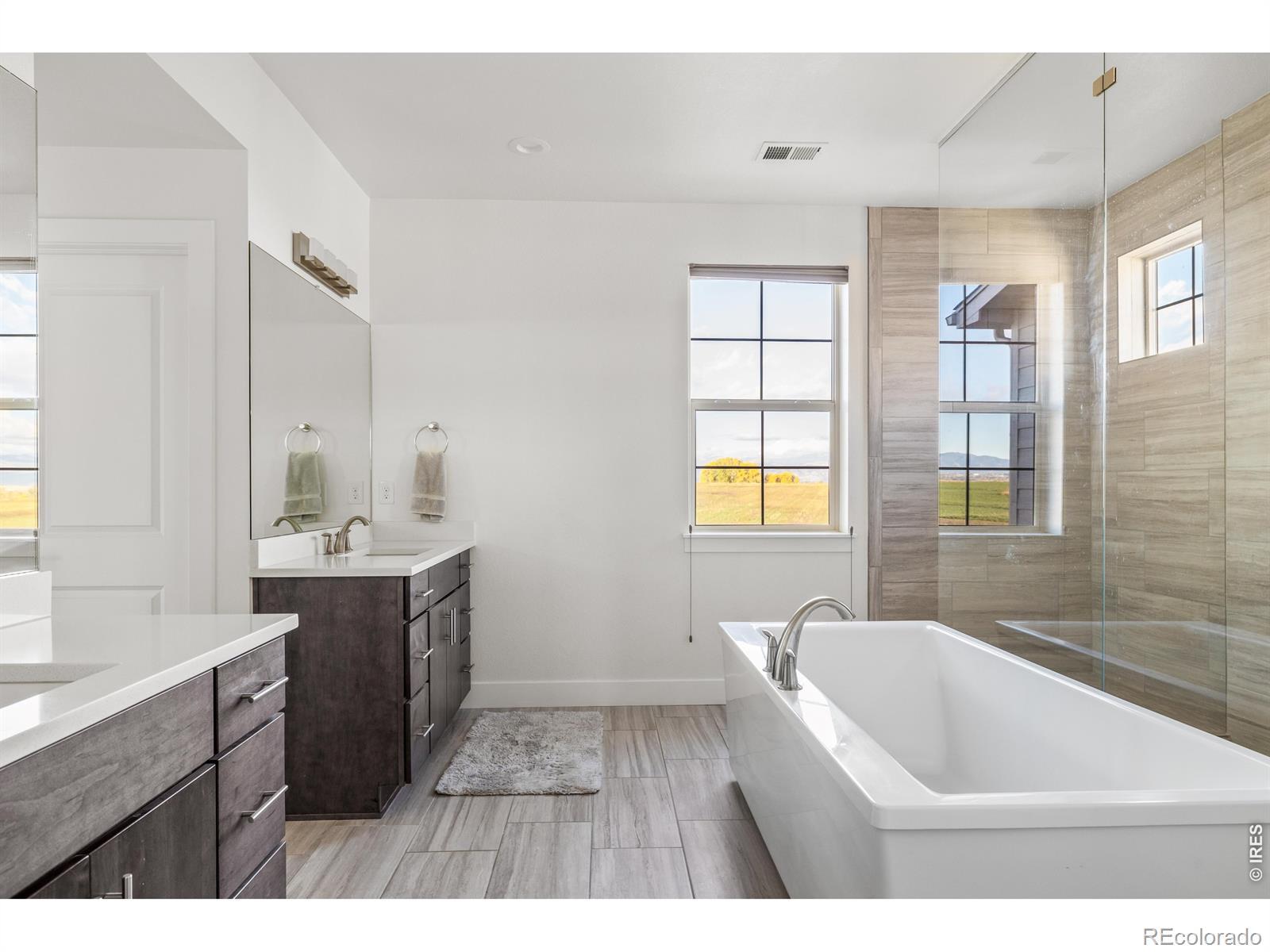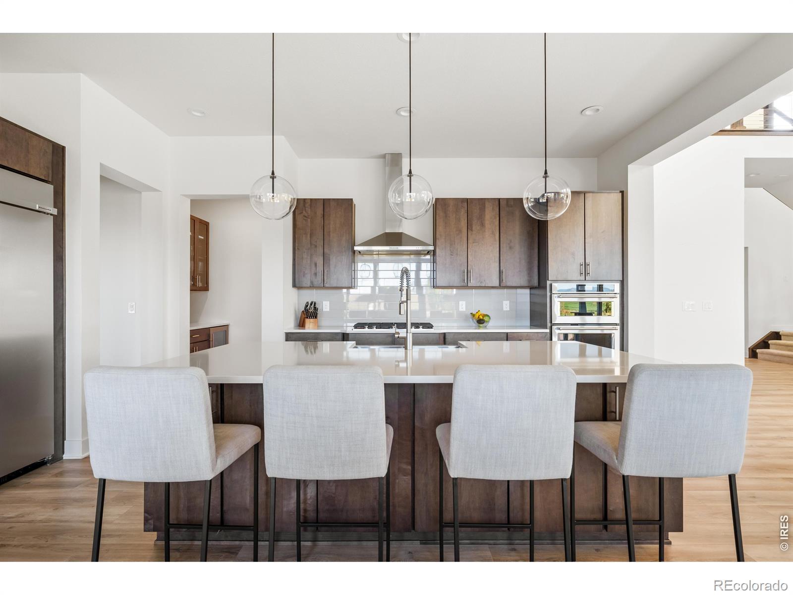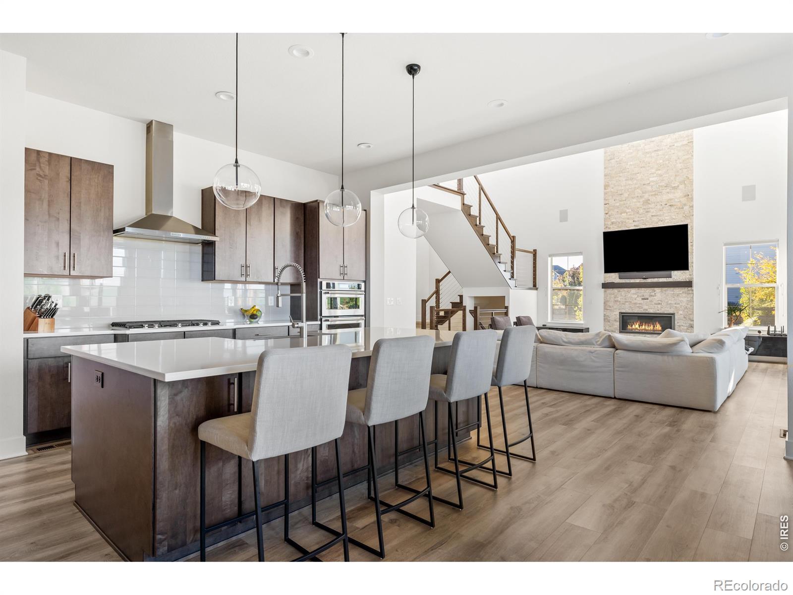 Turnkey luxury living awaits in this sun-drenched, newer-construction Erie 4BD/3.5BA featuring expansive, upgraded interiors and poolside outdoor space. Inside this 3,954SF home, soaring ceilings and oversized windows create a bright and airy ambiance, while crisp white walls, wide-plank flooring and a soaring staircase bordered by metal-and-wire handrails underscore the contemporary aesthetic. The double-height living room features a gas fireplace, floating built-ins and double exposures. Chefs will love the gourmet open kitchen's top-of-the-line KitchenAid appliance suite, custom cabinetry, breakfast nook, and island dining counter, topped by Restoration Hardware pendants. A walk-in pantry adds storage, while a butler's pantry with a wine refrigerator leads to the formal dining room. Off the kitchen, a secondary suite is perfect for guests. A home office, powder room and mudroom complete the well-planned main level. From the living room, oversized sliders tempt you outdoors. Enjoy barbecues on the covered patio flanked by a summer kitchen, or warm yourself near the built-in gas fire pit. Ahead, the heated saltwater pool is surrounded by a sun deck, manicured landscaping and unimpeded mountain views. Head to the upper level to discover a large family room with views over the living room. The stunning primary suite boasts a king-size bedroom, private deck, two extra-large custom closets and an en suite spa bathroom. Two spacious secondary bedrooms share a Jack-and-Jill bathroom, while a large utility room with a GE washer-dryer makes laundry day a breeze. A 2,070SF unfinished lower level provides room to grow, and an oversized four-car garage adds plenty of off-street parking. Located in Flatiron Meadows, a peaceful enclave featuring foothills views, walking/biking paths, parks and easy access to Erie and Louisville amenities and BVSD schools, including nearby Meadowlark School. Discover serene country living just 20 minutes from Boulder and 40 minutes from Denver.