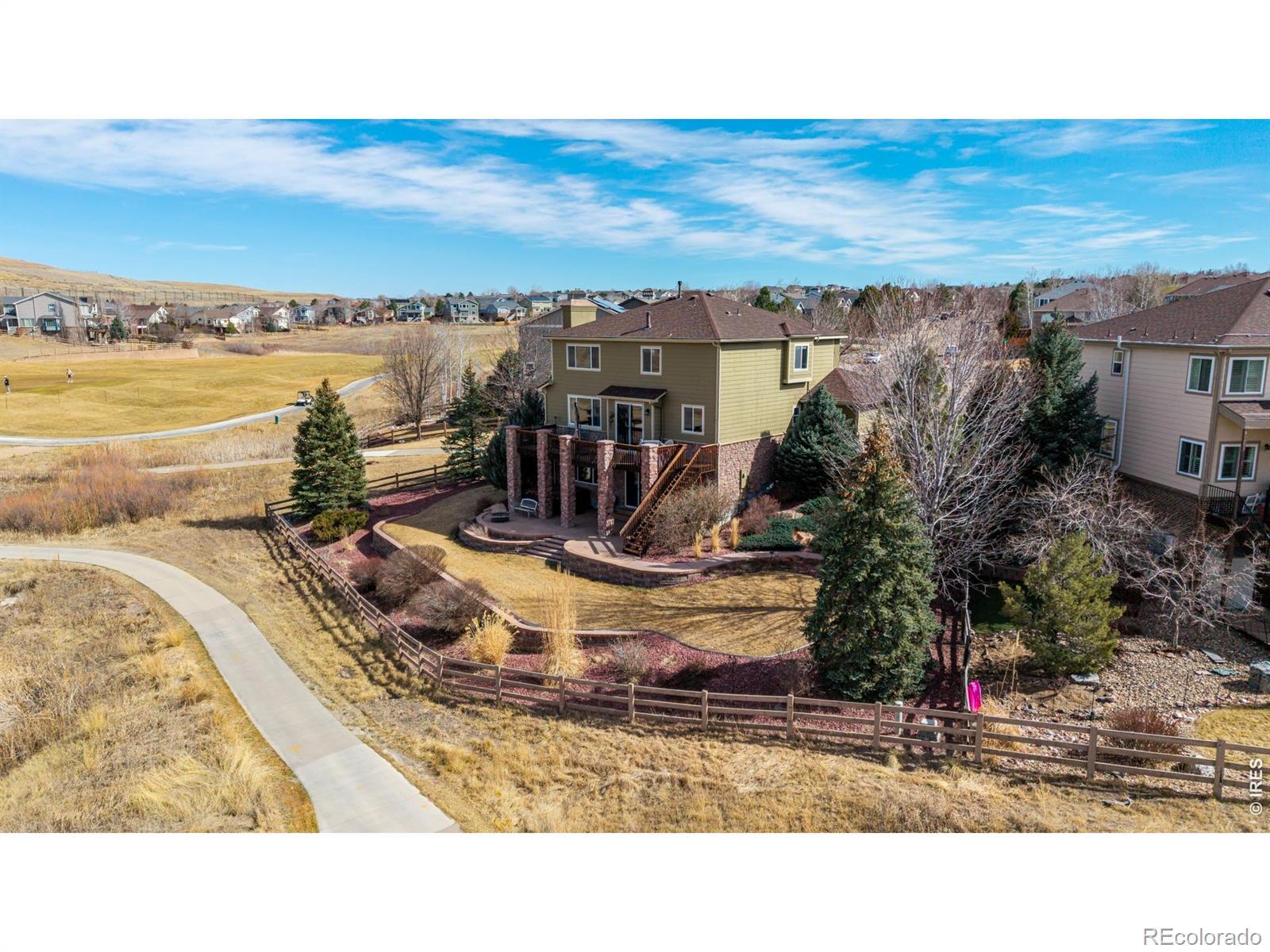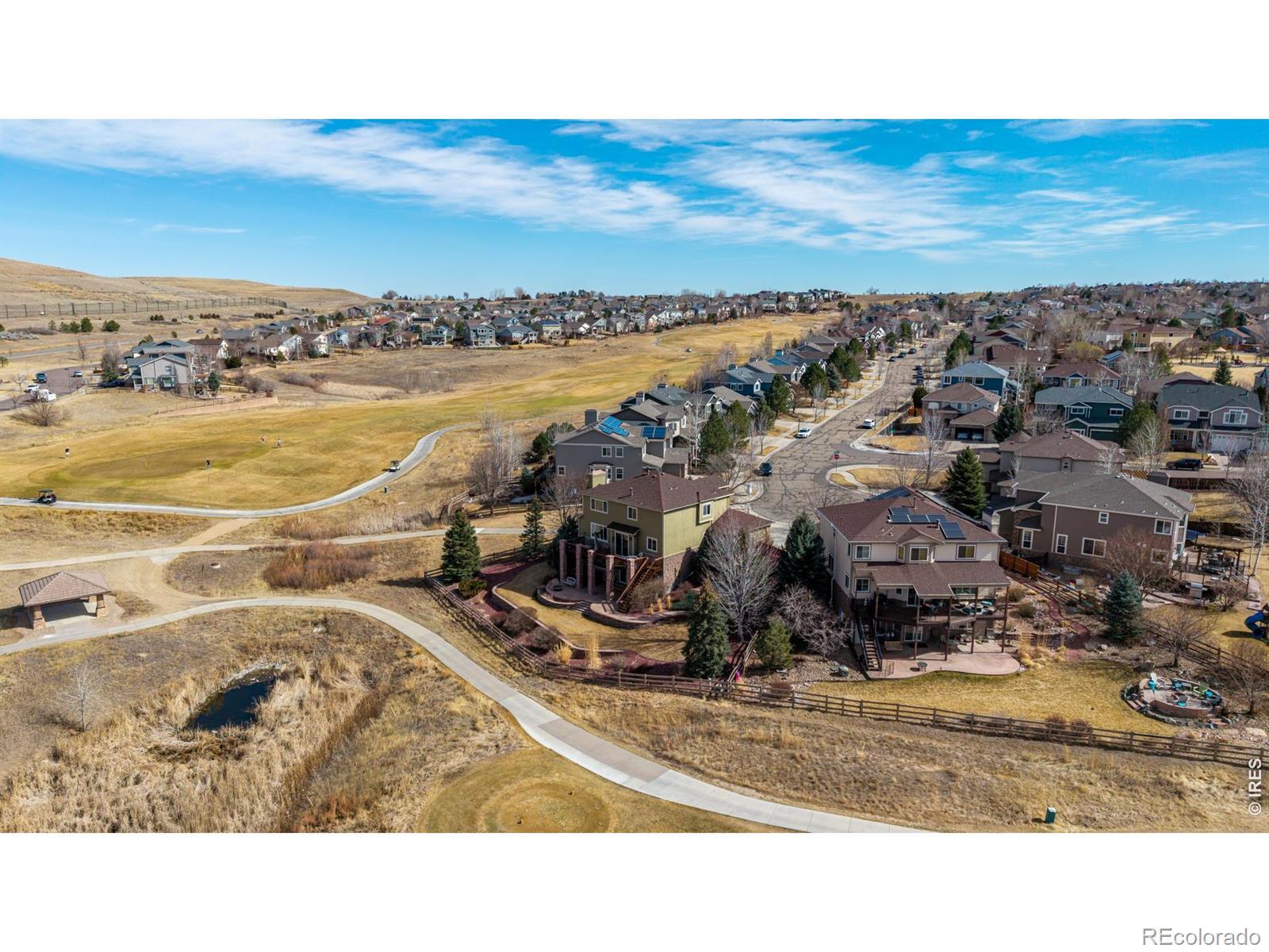 Welcome to this exceptional 5-bedroom, 4-bath home in the highly sought-after Vista Ridge community-perfectly positioned at the end corner of a quiet cul-de-sac and backing to the 16th tee box of Colorado National Golf Course. With gorgeous, unobstructed mountain views as your backdrop, this home offers a setting that's truly hard to find. Situated on a huge quarter-acre lot, the property provides space, privacy, and incredible outdoor living. Enjoy evenings on the lovely, oversized patio, where panoramic views and open skies create the perfect atmosphere for relaxing or entertaining. Inside, the open floor plan is light, bright, and designed for both comfort and connection. The living room features vaulted ceilings, creating an airy, dramatic feel while enhancing the natural light throughout the main level. The spacious living areas flow seamlessly into the kitchen and dining spaces, making the home ideal for everyday living and gatherings alike. The newly finished walkout basement expands your living space beautifully, featuring a dedicated media room and a stylish wet bar, perfect for movie nights, game days, or hosting friends. With five generously sized bedrooms and four bathrooms, there's flexibility for guests or work-from-home needs. Additional highlights include a 3-car garage with ample storage and an unbeatable location within walking distance to parks, two community pools, and miles of scenic walking and biking trails. This is Colorado living at its best-golf course frontage, mountain views, and a prime lot in one of the area's most desirable neighborhoods.