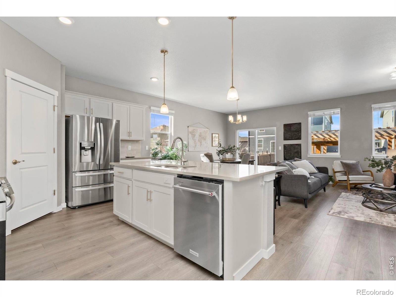 Like new 3 bedroom ranch in Vantage, a vibrant community with its own parks, community pool, splash pad, gym, clubhouse and dog parks. Enjoy comfortable living all on one level with a bright open living room/dining room, cozy stone fireplace and gorgeous white kitchen with a large island ample for seating and serving, walk in pantry stainless appliances including a new gas range (convection and air fry) and lots of counter space. The primary suite and ensuite bath are spacious with a double vanity, low threshold shower and walk in closet. A wooden portico provides cover on the patio with lots of room to garden or relax outside. Tons of space in this three car garage and a huge basement that can expand to add another bed, bath and large family room with storage room left to spare. Near the Berthoud Rec Center and included for the community privileges to TPC resort amenities including use of their world-class Fitness Center, Resort Style Pool with swim-up bar and hot tub, and restaurants. Lower your rate- preferred lender 2% buy down incentive offered- please inquire!