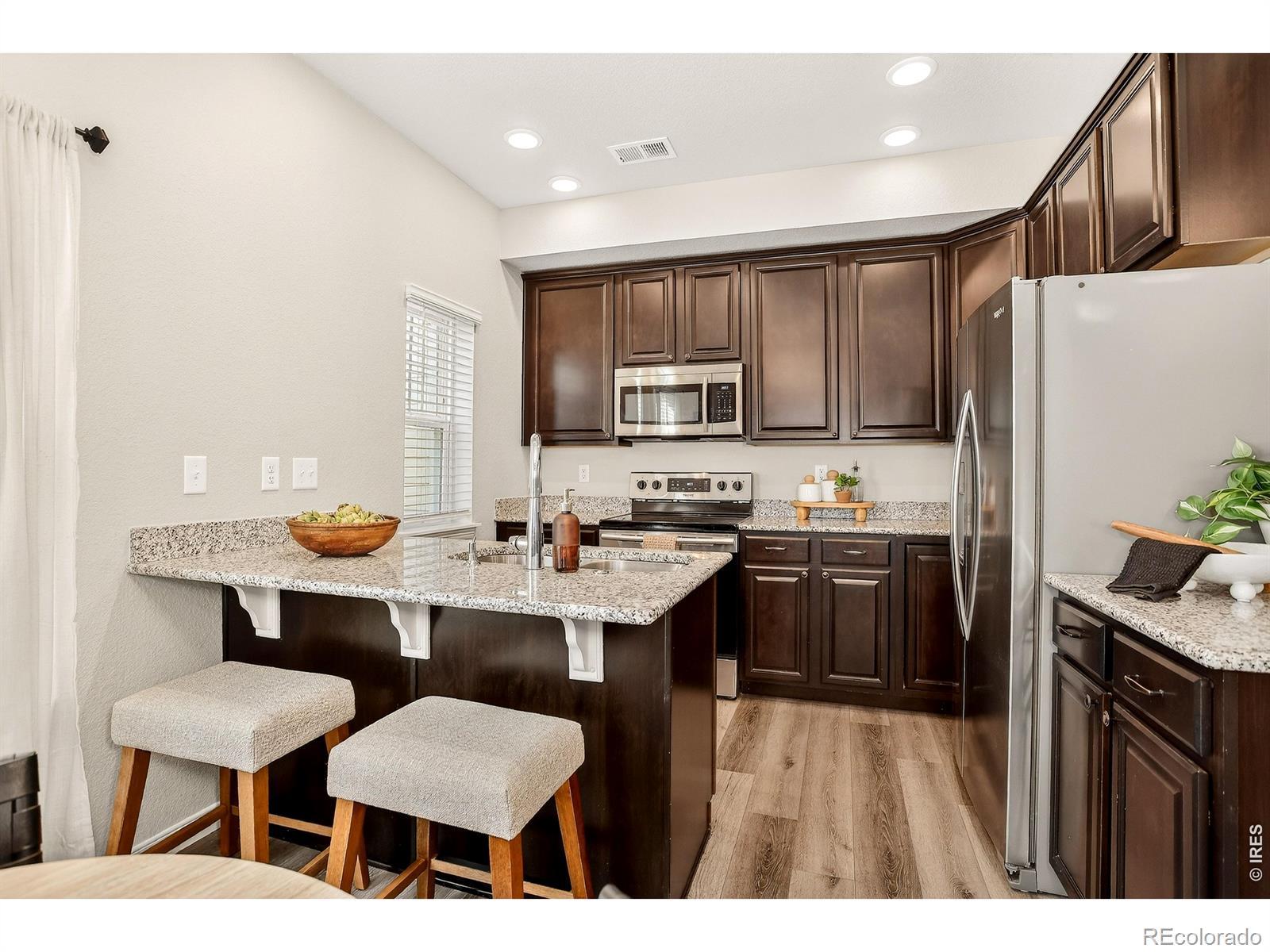 Welcome home to this inviting end-unit townhome in the heart of Berthoud, where comfort, convenience, and natural light come together beautifully. With 3 bedrooms, 2.5 baths, and a single-car garage, this thoughtfully designed home lives much like a single-family residence. Step inside to find engineered wood flooring throughout the main level, creating a warm and welcoming space for everyday living. The kitchen is both modern and functional, featuring granite countertops, stainless steel appliances, with plenty of prep space, making it perfect for everything from casual meals to entertaining friends and family. A stackable washer and dryer are included, adding convenience and value. Upstairs, the primary suite provides a comfortable retreat, complete with a 3/4 bath featuring dual vanities and an oversized walk-in closet with generous storage. Two additional bedrooms offer flexibility for family, guests, or a home office. Location truly sets this home apart. All schools are within easy walking distance, and nearby trails invite you to enjoy Colorado's beautiful outdoors. For those 4-legged family members, enjoy the convenient dog park directly to the north of the property. Spend your evenings strolling to local shops and restaurants, all just minutes from your front door. If you're searching for low-maintenance living with the space, light, and feel of a single-family home, this exceptional Berthoud townhome is an opportunity you won't want to miss.