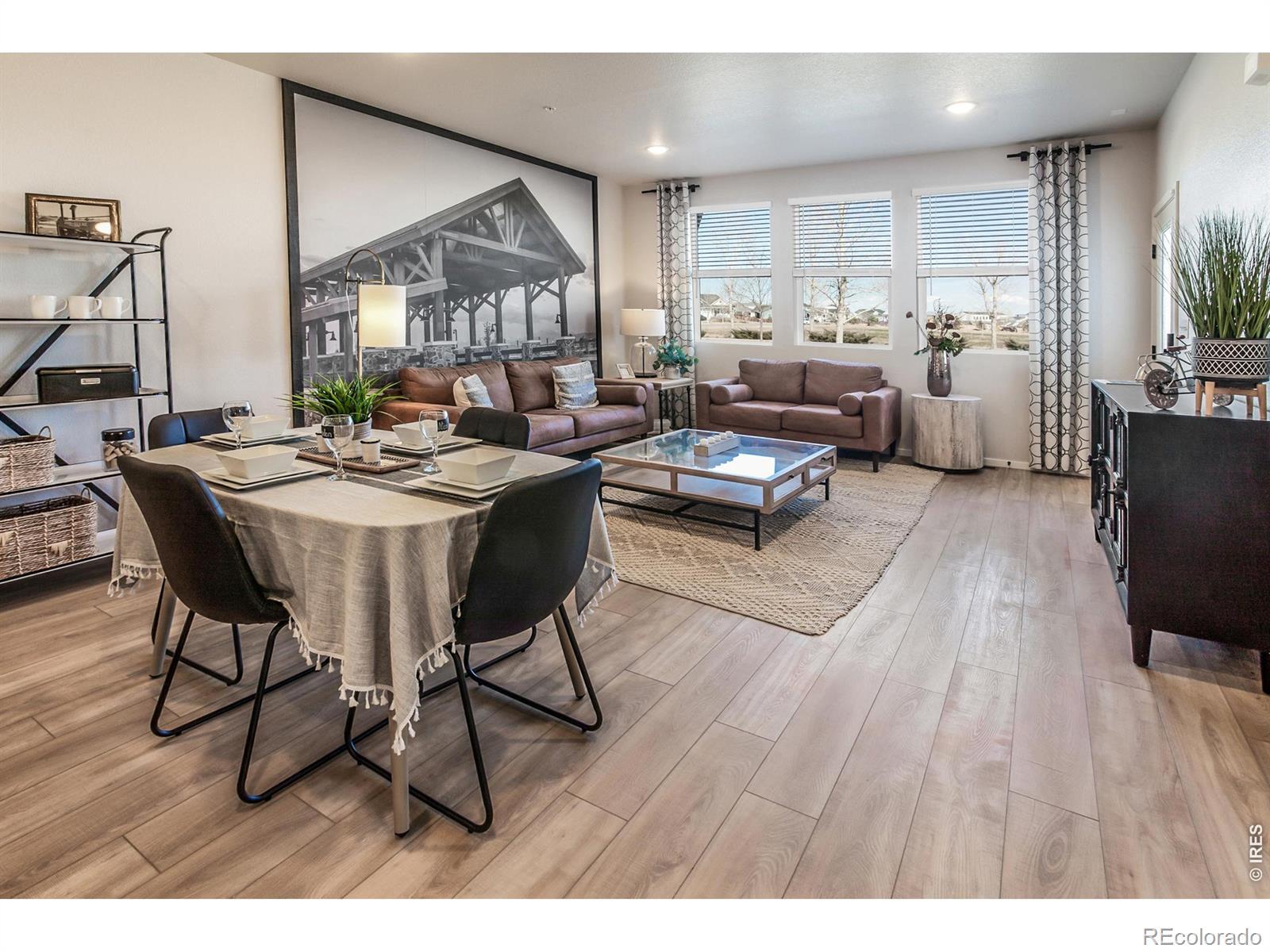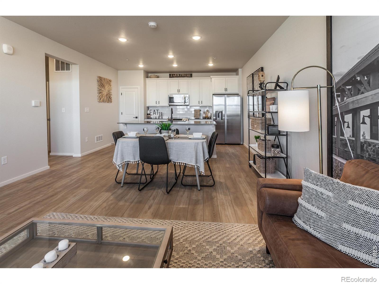 Enjoy easy, low-maintenance living in this beautiful MAIN LEVEL condo located in the highly desirable Raindance community. This is the former model home and can be purchased WITH FURNISHINGS, making it completely move-in ready! Surrounded by parks, scenic trails, orchards, and expansive green spaces, this home offers both comfort and convenience in a vibrant neighborhood setting. Inside, vinyl plank flooring flows throughout the main living areas and primary bedroom, and several custom accents help to create a cozy and modern feel. The kitchen features stainless steel appliances, white maple cabinetry, quartz countertops, and a stylish subway tile backsplash, all designed to blend function and style. The spacious primary suite includes a walk-in closet and a private bath with a sleek frameless glass shower and dual vanities. Additional conveniences include an included washer and dryer and installed window coverings. Relax outside on the covered front porch, and enjoy the added benefit of an attached one-car garage. This home is truly a must see!